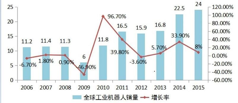 據國際機器人聯合會統計,全球機器人市場規模不斷擴大,2015年全球工業機器人銷量超過24萬臺,同比增長8%。2006-2015年,全球工業機器人銷量年均增速約為14%。2014年亞洲銷量約占2/3,中國、韓國、日本、美國和德國五大市場的銷量占全球工業機器人總銷量的75%左右。近十年全球工業機器人銷量見圖1所示。2014年全球專用服務機器人銷量為2.4萬臺,較2013年同比增長11.5%;銷售額達到37.7億美元,較2013年同比增長3%。2014年,全球個人/家用服務機器人銷量約為470萬臺,較2013年同比增長28%;銷售額達到22億美元。鑫泰數控加工中心機器人龍門