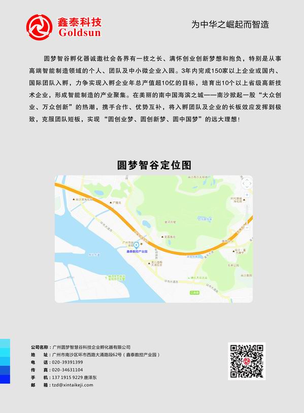 圓夢智谷孵化器是廣東鑫泰科技集團投資建設,面向智能制造的專業孵化器,位于廣州 市南沙區鑫泰數控產業園,孵化場地總面積2萬平方米,園區環境優美,基礎設施完善。 圓夢智谷孵化器借力母公司在智能制造特別是機器人領域的技術優勢、產業優勢,利用 自有產業園,憑借“核聚變創業創新,打造中國智造新生態”的理念,提供智能制造領域專 業孵化服務,打造面向智能制造產業的高科技孵化器和國際投資合作平臺,吸引全球智能制 造的高端人才、資金、項目進駐,并提供中試基地和設備、技術服務、檢驗檢測服務、供應 鏈管理、市場推廣、法律、財務、產業投資、融資、政策扶持、后勤管理等服務。為有夢 想、有能力、想創業的人才提供智能制造領域創業、創新孵化服務,充分克服短板效應,發 揮長板效應,助推成長! 圓夢智谷孵化器目前已有三+多個智能制造產業鏈項目入園孵化,包括人工智能、軟件 編程、精密加工、各種機器人、機器人控制系統、數控智能設備、大數據與信息化項目等。 我們總結并創新了一套在智能制造行業發展的獨特思路和模式,以擁有核心技術的智能制造 領先企業為主導,以國際智能制造產業鏈集群協同合作為主線,以資本孵化為推動力,以園 區產業技術和國際合作平臺為資源,以阿米巴模式實現自主經營管理和發展,實現各個項目 的裂變、聚變和核聚變,打造機器人等智能裝備產業的國際合作平臺,孵化助推智能制造領 域的中小微企業成長,創新驅動,最終實現智造產業鏈新生態。 孵化器以市場為導向,以政策為助推,以技術為支撐,提供全產業鏈服務,堅持先進制 造技術的發展方向,以高端裝備、工業機器人與智能化制造、互聯網信息化等企業為服務對 象,按“創業導師+核心技術支撐+產業鏈整合+中試生產檢驗平臺支持+天使投資”的運營方 式,打造集群化孵化服務平臺和共享環境,降低創業企業的創業風險和創業成本,提高創業 團隊的成活率和成功率。 眾智、眾創、共享、生態,形成聚變,加上資本運營的力量,實現核聚變。為中國智能 制造的中小微企業提供孵化服務,助推成長,打造中國智造新生態,是我們的追求!為中華 之崛起而智造,是我們的使命!