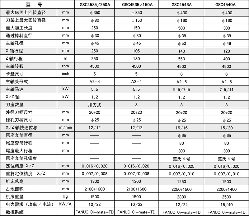 GSC45系列臥式斜床身全功能數(shù)控車床是一種中等規(guī)格、高效通用自動(dòng)化機(jī)床。該系列機(jī)床配備了先進(jìn)的FANUC 0i-Mate-TD系統(tǒng),具有CNC標(biāo)準(zhǔn)功能,同時(shí)配裝八/十/十二工位液壓轉(zhuǎn)塔刀架或排刀裝置,以滿足切削時(shí)自動(dòng)換刀需要,可完成多種工序的車削加工。該機(jī)床廣泛適用于軍工、汽車、航空、模具等制造行業(yè)的各種零件的精密加工。同時(shí)由于機(jī)床剛性好,加工精度穩(wěn)定,適合于各種軸類、盤類零件的中、大批量生產(chǎn)。 本機(jī)主軸單元為獨(dú)立主軸(套筒式),電機(jī)直連無(wú)級(jí)調(diào)速結(jié)構(gòu)。可選配高精度的SKF、FAG及NSK、NTN等著名品牌的主軸專用軸承,同時(shí)使用進(jìn)口專用軸承潤(rùn)滑脂,整個(gè)主軸單元精度高、剛性好。主軸經(jīng)嚴(yán)格的動(dòng)平衡測(cè)試,精度高,精度保持性良好,熱變形小。熱穩(wěn)定性佳,最高轉(zhuǎn)速可達(dá)4500RPM。 進(jìn)給系統(tǒng)全部由伺服電機(jī)直聯(lián)驅(qū)動(dòng)、剛性、精度、動(dòng)態(tài)響應(yīng)特性好。兩軸導(dǎo)軌均采用中等預(yù)壓的線性導(dǎo)軌。